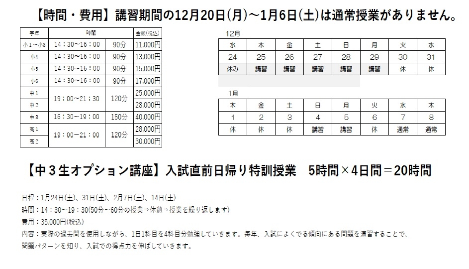 内容:小学生~中2は2学期の復習と復習が終わり次第、3学期以降の予習に入っていきます。高校生は予習(必要があれば復習も致します)、中3は入試対策授業となります。また、中1、2年生は年始の2日間の授業は学調対策授業も実施いたします。学年によって時間帯が決まっておりますのでご注意ください。